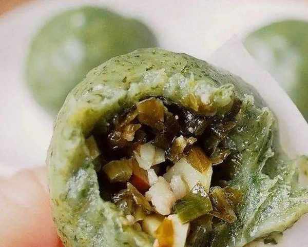 原料:糯米粉280、粳米粉120g、艾草100g、热水适量、食用碱3g、雪菜笋肉馅适量。