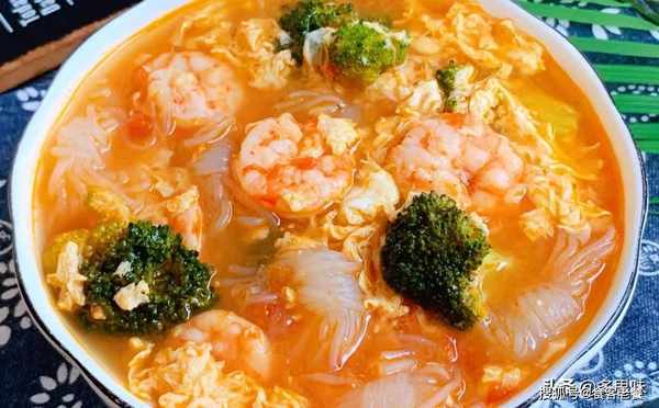 虾12只、番茄2个、西兰花半棵、魔芋结适量、鸡蛋2个、姜丝适量