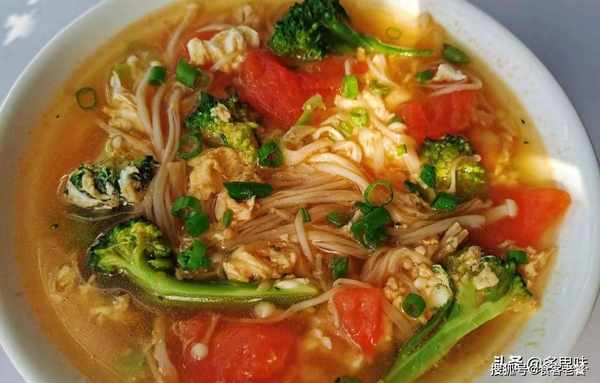 3锅热放点底油,把蒜末爆香,放入西红柿翻炒出沙,加一点生抽继续翻炒。加两碗水煮开,依次放入金针菇和西兰花,继续煮一分钟。鸡蛋打散倒入锅里,再放一点盐和胡椒粉调味。出锅前撒点小香葱就好了。
