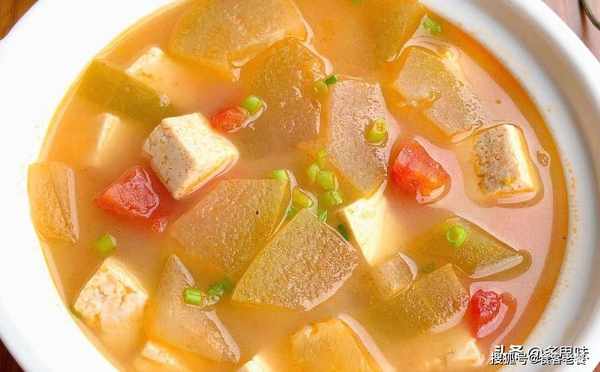 2锅里放少许油放葱花炒香,放番茄炒出汁,放冬瓜翻炒,倒入2碗热水,放入豆腐,盖上锅盖,中大火烧10分钟➕1匙盐➕1匙鸡精,撒胡椒粉出锅