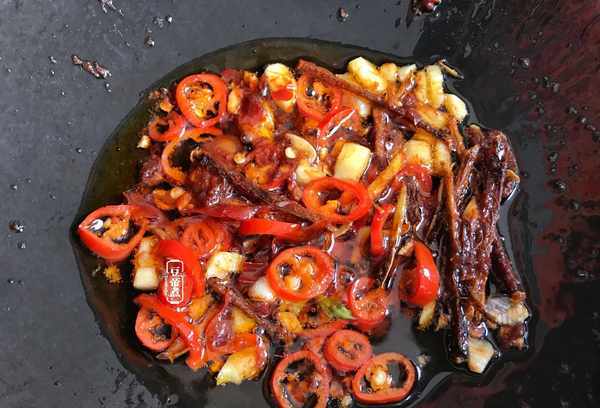 5、倒入切碎的大蒜和辣椒炒香,然后一勺一勺加入豆瓣酱边炒边炒出香味和红油。