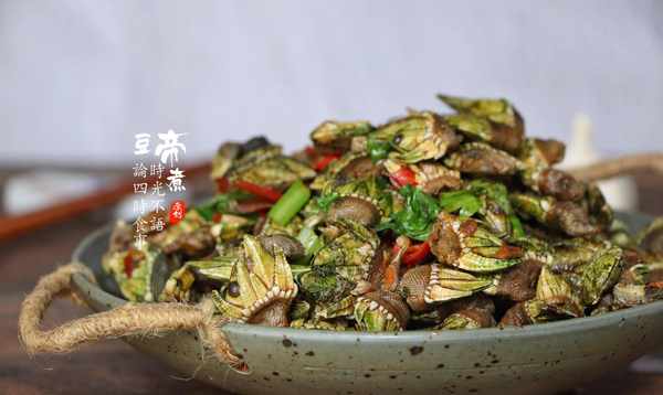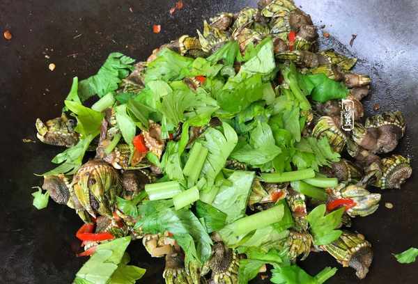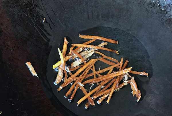 6、然后倒入佛手,边搅拌边炒。根据热量,您可以加一点水和调味。
