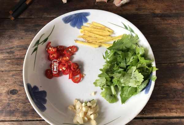 材料:药明佛手、芹菜1个、姜3片、红辣椒1个、蒜2瓣、豆瓣酱1汤匙、蚝油1汤匙、味精1茶匙、