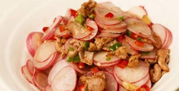 配料:萝卜,五花肉,油,盐,桂皮,料酒,高汤。五花肉:补肾、滋阴、益气。八角:理气、止痛、温阳。花椒:温中、止泻、止痛。做法:切好萝卜、肉和葱,把调料放进调料盒,起锅做油,油五成热,放入干辣椒,煸出香味儿。倒入五花肉,倒入料酒,煸炒五花肉,放入萝卜片,翻炒均匀。加入高汤,没过肉片和萝卜,放入调料盒炖煮,加入生抽,大火烧开后,转小火煮五分钟,收汁即可。取出调料盒,盛盘,即可食用。