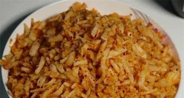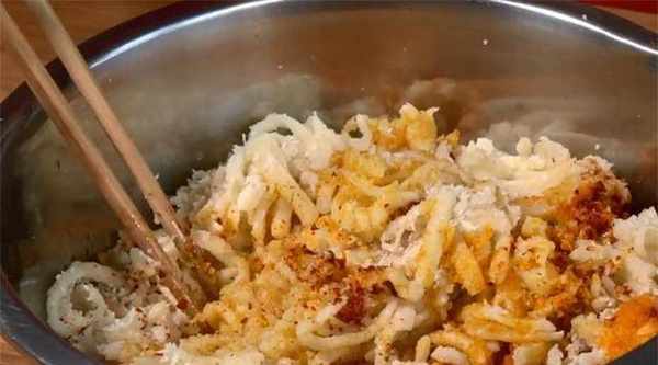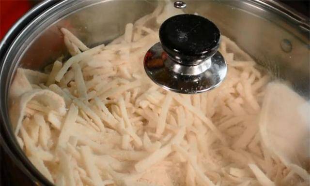 5、今天的土豆条就做好了。虽然主料是一个不起眼的土豆,但包好后蒸熟后,土豆条变得微微透明,金黄发亮。锅刚烧开,一股淡淡的土豆香味扑面而来。它很贪吃。加入香料和热油搅拌即可食用。真的很容易上瘾。
