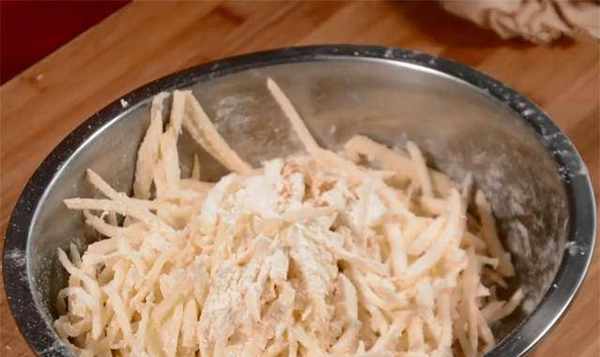 2、沥干水分后,加入面粉揉匀,加入五香粉轻轻揉搓,使每条土豆条都能均匀沾上面粉。