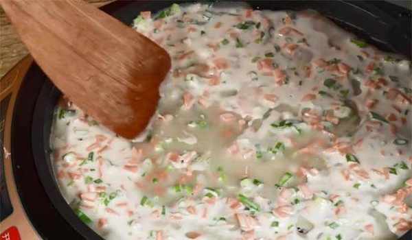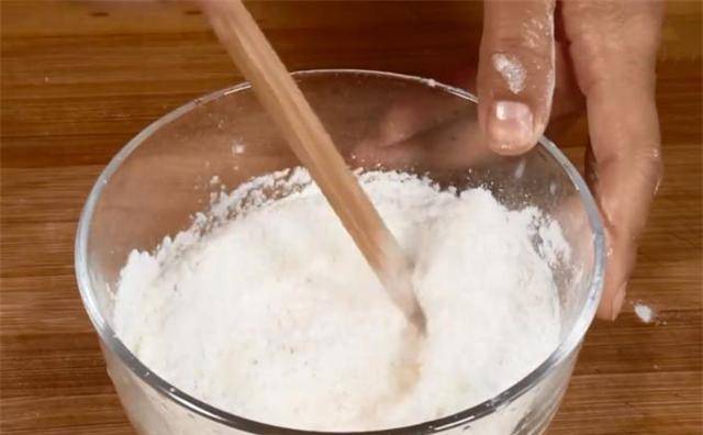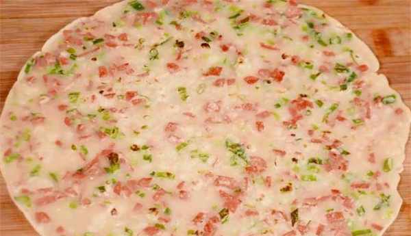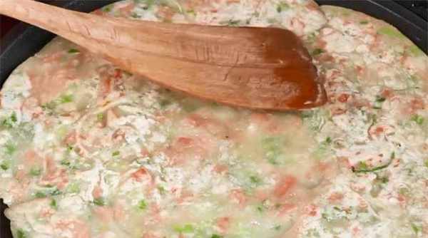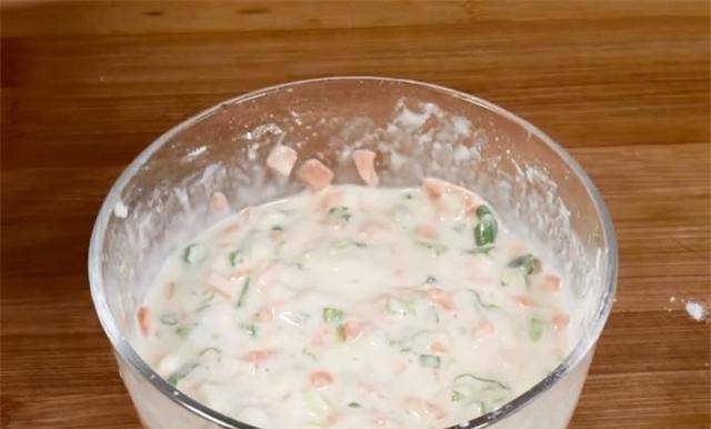 4、放入葱花、素火腿丁,然后加水调成糊状,就这样,不要把面团弄得太稀,否则不容易成型。