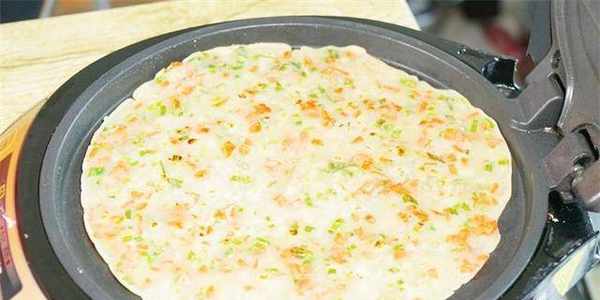 5.电饼铛抹少许油,倒入一勺面糊,用木铲轻轻抹平,盖上锅盖炸2-3分钟。