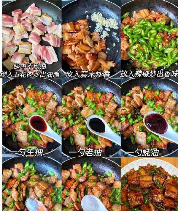 总之,青椒炒肉是一道简单又美味的家常菜,它以五花肉、尖椒和蒜瓣为主要食材,配以生抽、老抽、蚝油、盐和白糖等调味品,烹制而成。它不仅味道鲜美,而且做法简单,非常适合家庭烹饪。除了以上提到的配料外,你也可以根据自己的口味喜好进行调整,例如加入一些辣椒、姜片等调味品,使得这道菜更加丰富多彩。