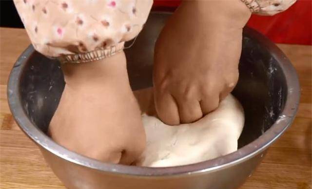 3、面团醒好后取出,像这样用手轻轻推一下揉一会,面团应该稍微软一点。