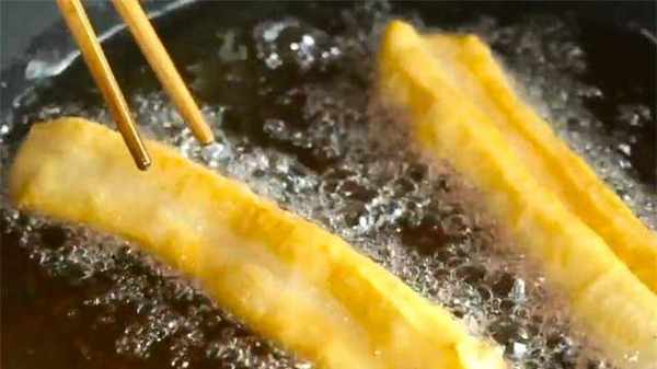 9、锅中加入更多的油。油70%热时,用手捏住两端,轻轻拉入锅中。这时,我们要用筷子快速翻动一下,让油条受热均匀。在此期间,油条迅速膨胀成型。这里需要注意的是油温为180°C-200°C。油温太高,油条容易烧焦。