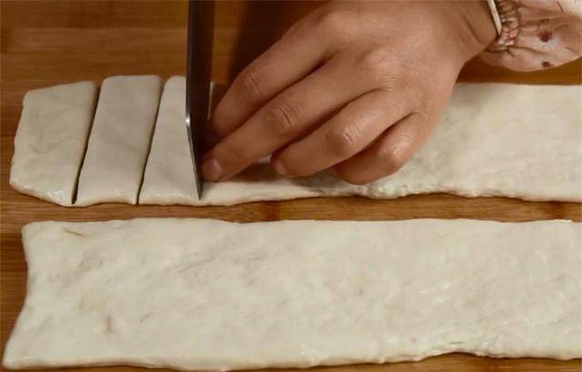 8.然后将切好的面团层层叠叠,将棍子压入叠好的面团中间。至此,油条就做好了。这里需要注意的是压力要适中,只粘中间的部分,用力过猛会弯曲,用力过轻两部分会分开。