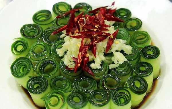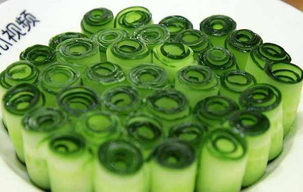 2.把黄瓜片一个一个卷起来,挨个摆放在盘子里面以免散开。