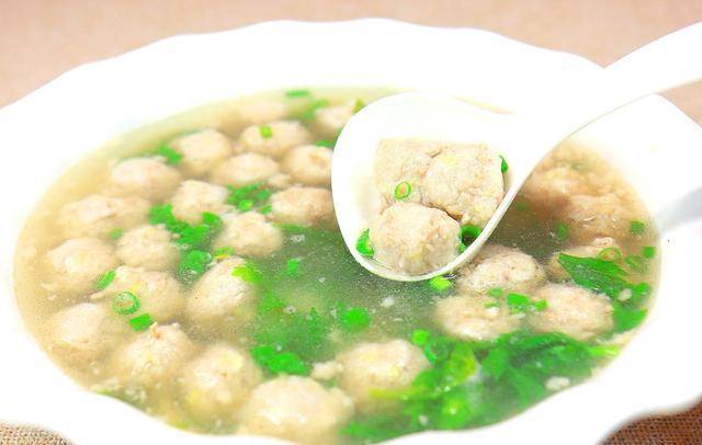 4.锅内烧水,家里有高汤的用高汤更加浓香,水烧开以后转微小火,抓一把馅料在虎口处挤成丸子,用小勺挖入锅中,如果粘勺子可以蘸一点清水,丸子下完以后放入芹菜段,加入食盐、胡椒粉和鸡精调味,煮至丸子全部飘起来,淋入一些芝麻香油,美味即成。