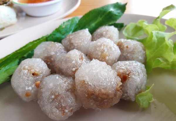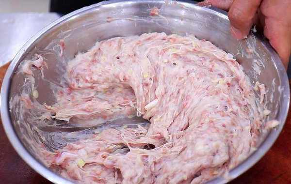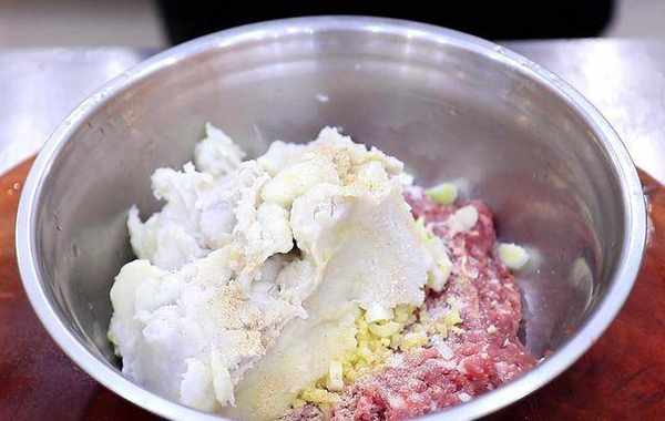 2.40分钟以后,把蒸软、蒸透的芋头取出来,放入凉水中冷却一下,晾凉以后剥掉外皮,用小勺摁压成芋头泥,放入肉馅中,加入食盐、胡椒粉。
