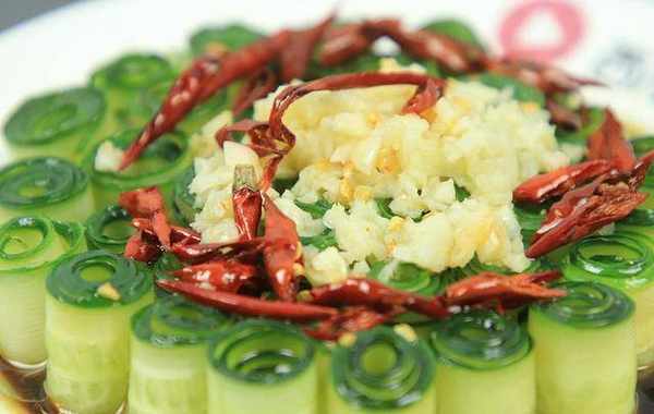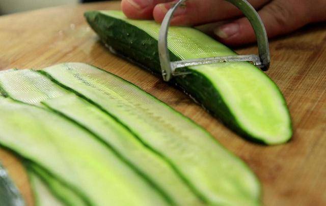 1.准备黄瓜三个,把黄瓜切出来一个平面放在案板上,用削皮刀刮成薄薄的黄瓜片。黄瓜尽量切得薄一些,这样更加入味。再切点蒜末、干辣椒段备用。