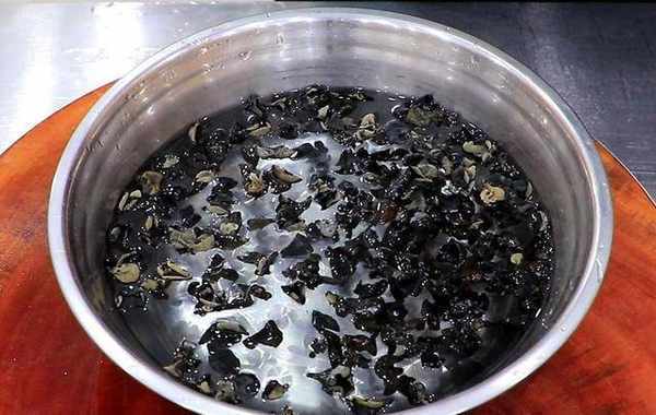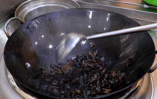 2.锅内留底油,倒入木耳煸炒一会儿,把里面的水分炒出来,听到有噼啪的声音就可以了,加入生抽5克,淋入一点清水,加入胡椒粉2克,蚝油3克翻炒化开调料,淋入少许明油增香提色,翻匀以后盛出来备用。