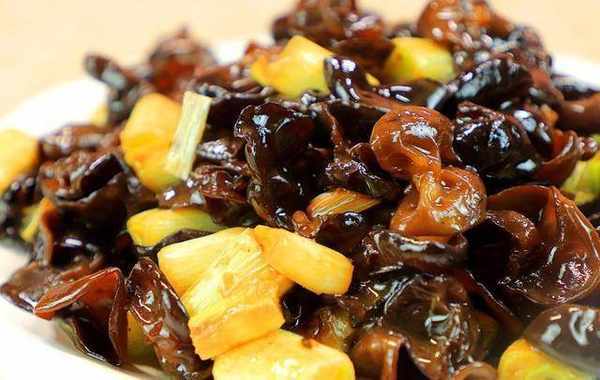 3.锅内烧油,油烧热以后倒入葱段,开小火慢慢煸炒,大葱煸香、煸成金黄色,把木耳倒入锅中翻炒均匀,勾入一点水淀粉,让调料更好地吸附在食材上面,再加一些明油提亮色泽,翻匀后即可出锅,美味即成。