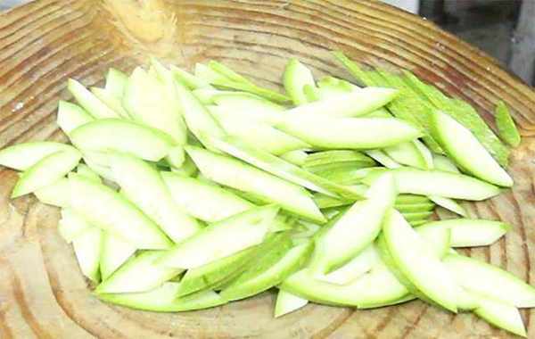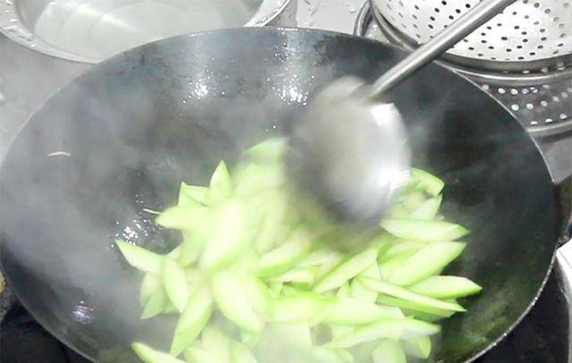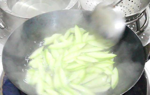2.锅内烧水,水烧开后倒入西葫芦,焯水10秒后倒出来,控干水分备用。