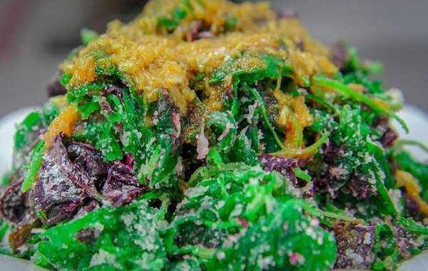 4.用蒜臼子捣一点蒜泥,捣蒜泥时加一点食盐,再倒入适量的芝麻油、生抽搅拌均匀后倒在蒸好的苋菜上,也可以在拌散苋菜时拌入,美味即成。