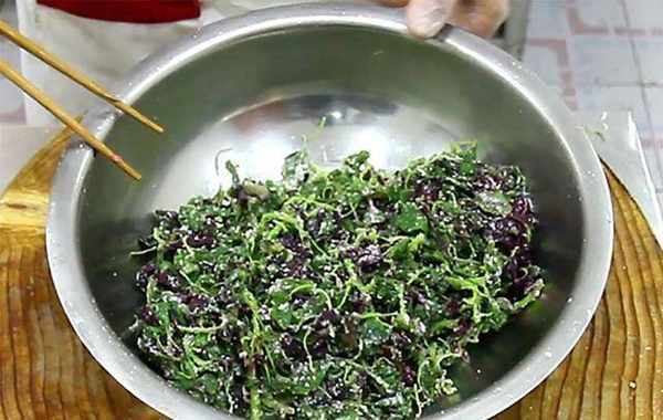 3.三分钟后,把蓖子端出锅,把苋菜叶倒入盆中抖散,一定要在温度没有凉下来之前拌散,再撒上一点食盐,颠盘拌匀后装在盘里。