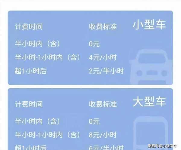 大型车:半小时内(含)免费,半小时-1小时内(含)8元/小时,超过1小时后,6元/半小时