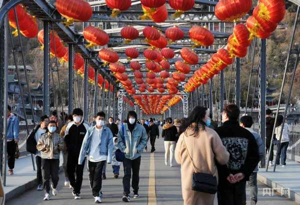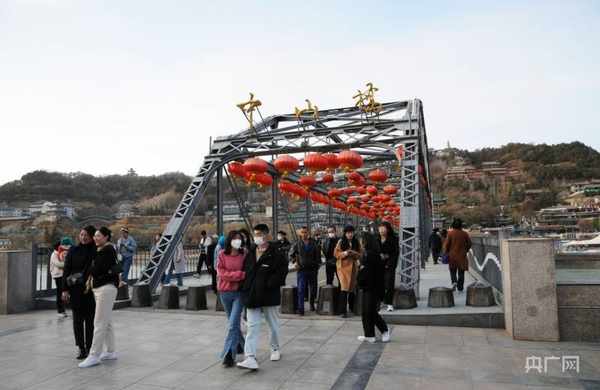 几名游客从中山桥上走过(央广网记者 李红军 摄)