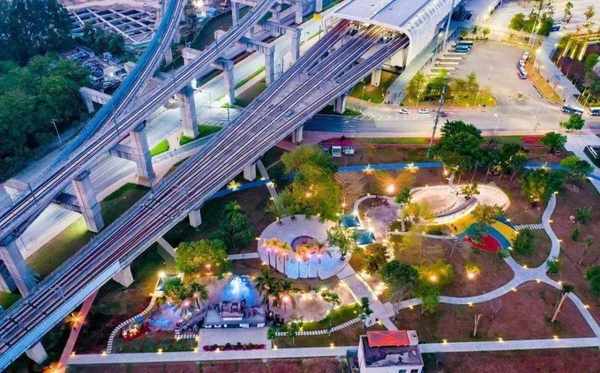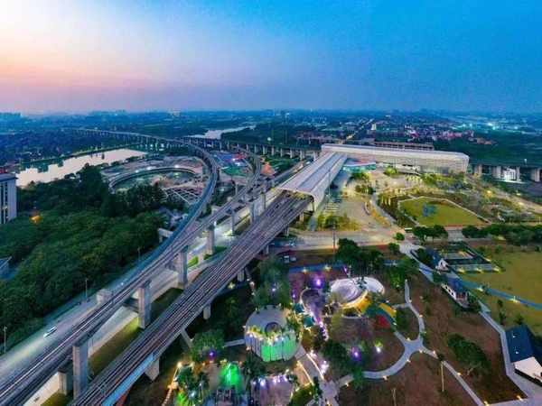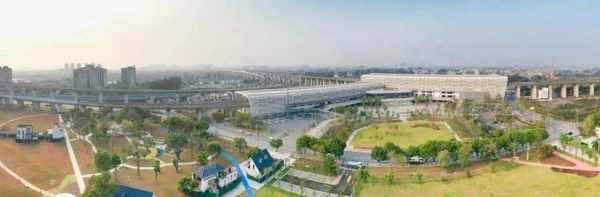东莞西站周边环境品质提升工程对原氹涌旧公园进行升级改造,融入喷泉、雾森、灯光等环境美化因素,不仅优化了东莞西站的出站体验,也打造了水乡生活场景,实现站城一体化空间高品质提升。
