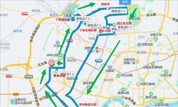 2、推荐于洪区景点自驾游行程路线:于洪区-黄海公园-丁香东湖智慧体育公园-丁香湖公园-观音寺-于洪怒江公园-于洪怒江东公园-浑河晚渡公园-于洪区。