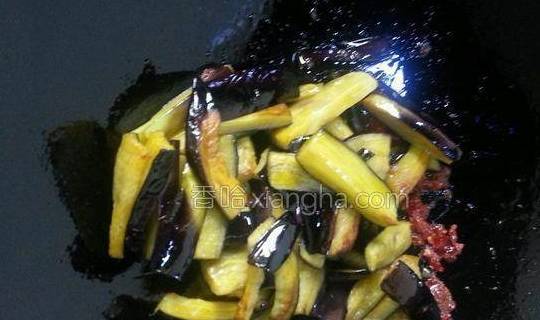 4.豆瓣酱爆香后,下炸好的茄子