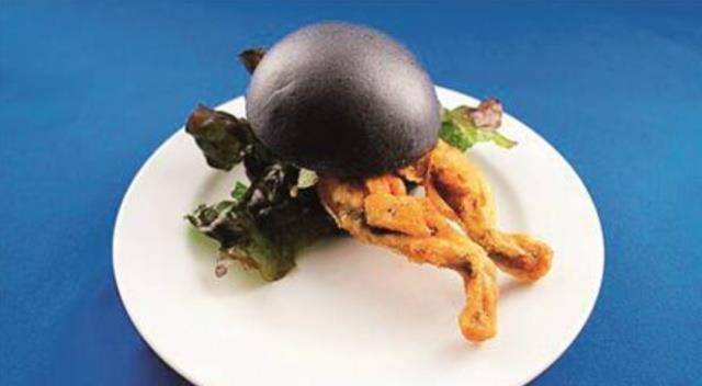 第一个,便是在日本被称之为“黑暗料理”的青蛙汉堡,从外观上来看,这道菜就像是一只青蛙平躺在碗里一样,在当地受到了极大的欢迎。导游称道,这种做法非常简单,将青蛙腿油炸之后,配上蔬菜水果这样就可以了!看着这个造型,想必许多中国女生们都难以下口吧!