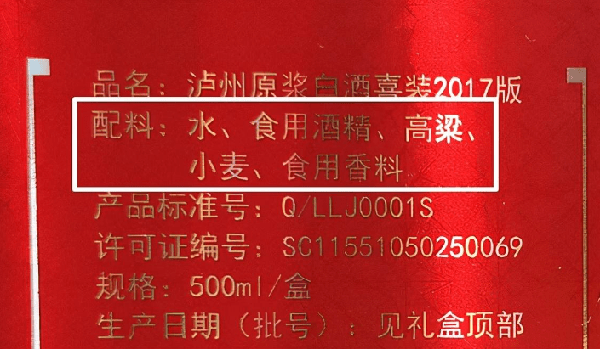 2. 看配料表的中的原料:原料里有食用酒精 食用香精的都不是纯粮白酒,还有其他各种各样的添加剂也不是纯粮白酒。