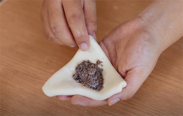 5.然后叠的这个面朝下,中间的位置我们放上用面粉拌的红糖馅,再把三个角折叠起来。
