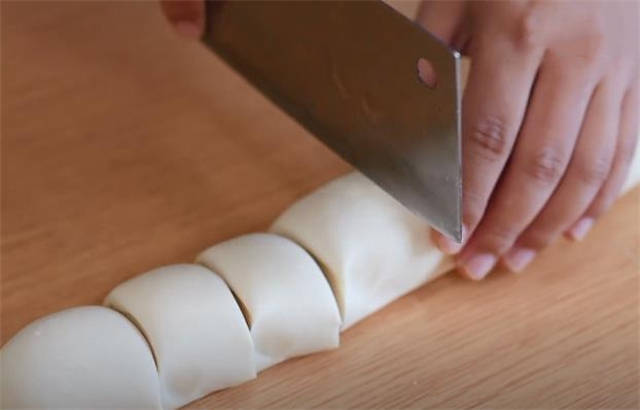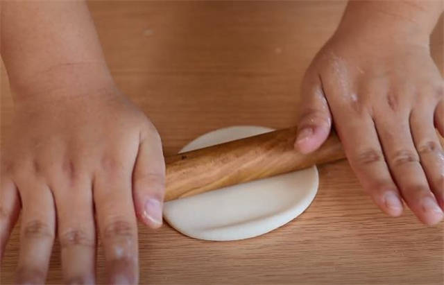 3.处理小面剂的时候,也要继续的把面揉匀揉透,然后按扁,用擀面杖擀成圆形的饼皮。
