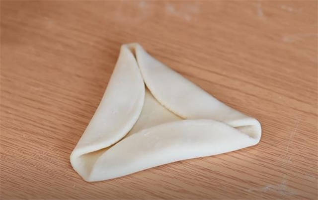 4.把饼皮向里这样折叠,你就会得到一个三角形的形状。
