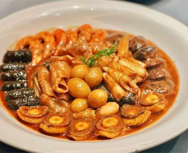 跟粤式盆菜近似(不同之处在于盆菜是鲍汁口味,李鸿章是咸鲜浓郁葱香口),花胶海参鱼肚鲍鱼鸽蛋.....都是难入味的食材,但用文火煨炖得软糯,咸鲜可口,醇香不腻。