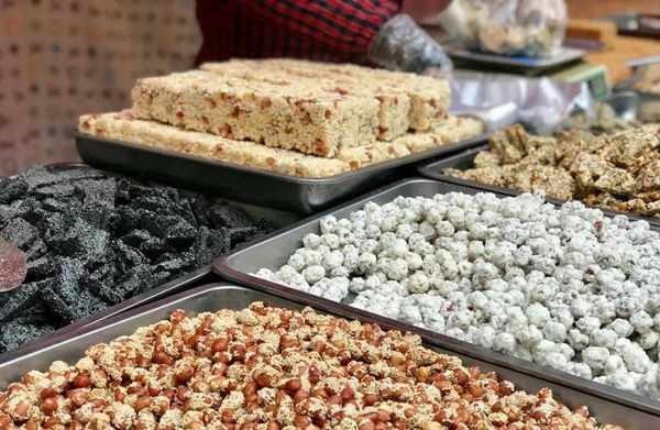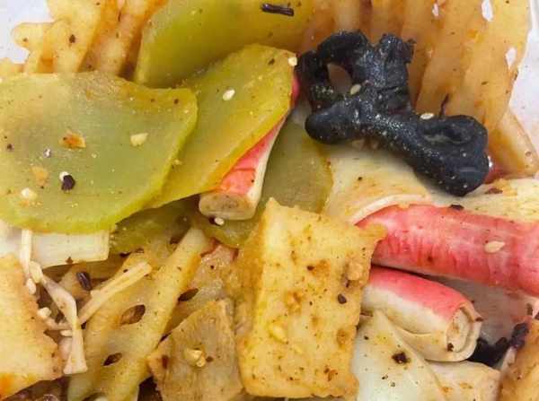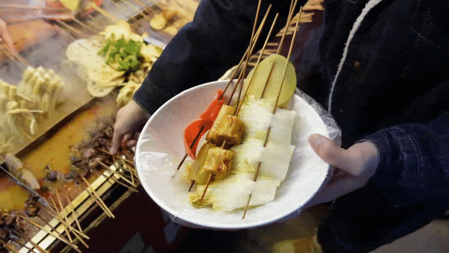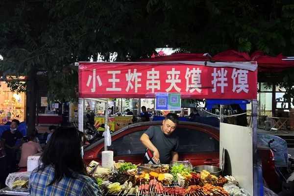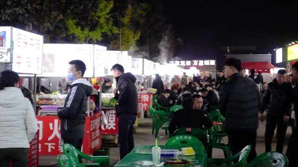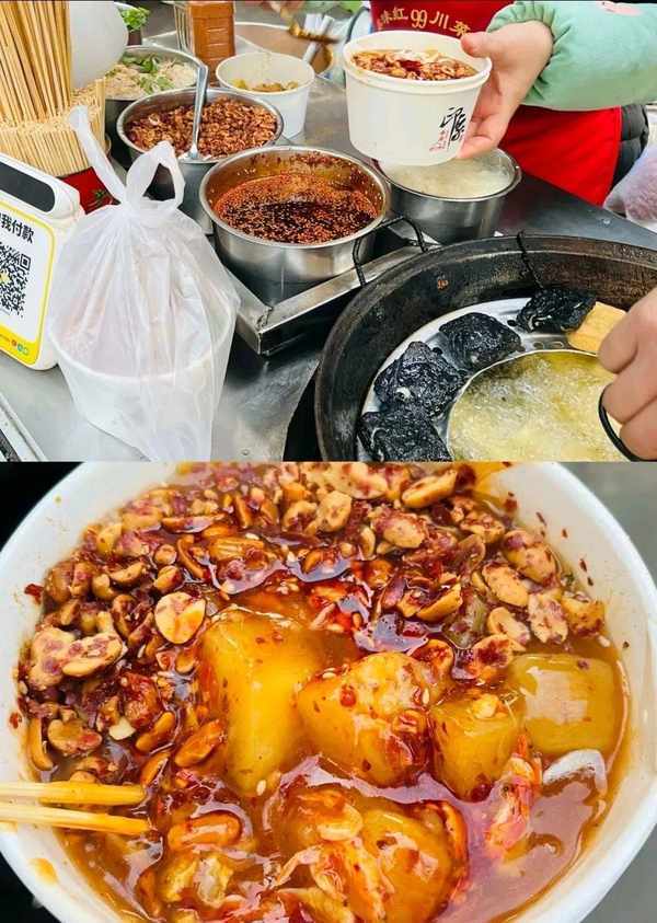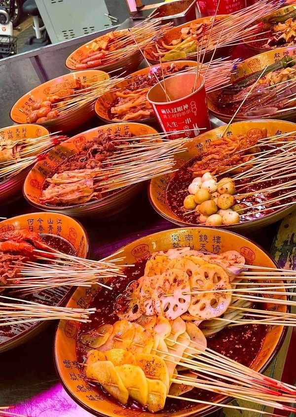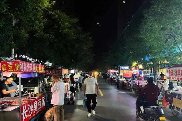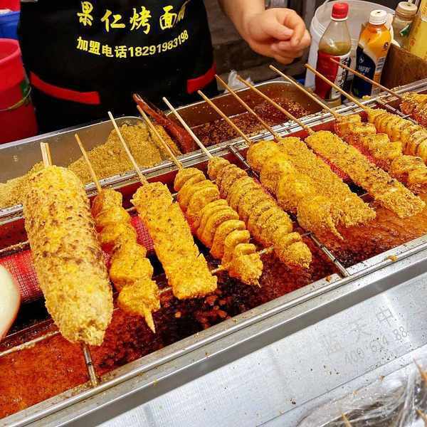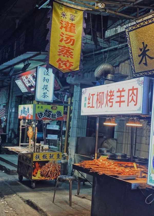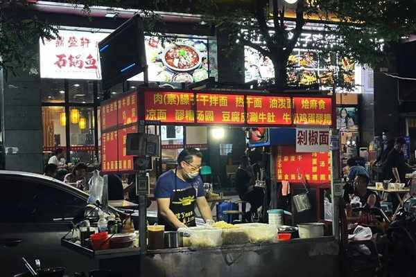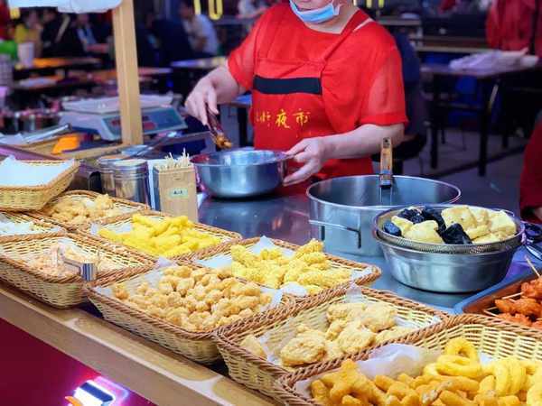 炸串、蒸饺、菜夹馍、冰粉、炒虾尾、 麻辣烫、烧烤肉串、臭豆腐、铁板豆腐、烤面筋、钵钵鸡、狼牙土豆、炸鸡……空气中飘荡着浓浓的美食气味。