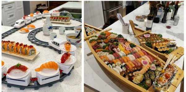 看看这两位别出心裁的网友,其中一个网友搭建了一个“火车站”,将寿司放在“车厢”上面。另一个则是制造了一馊“寿司之舰”。这样在与家人或朋友享用美食的过程中,更增添了一分趣味性。