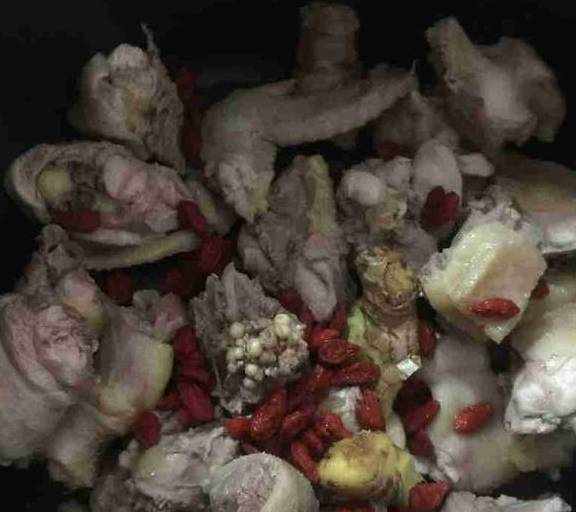 鸡半只、香菇(干)适量、小白菜几颗、姜4片、精盐适量、枸杞数颗、料酒一勺