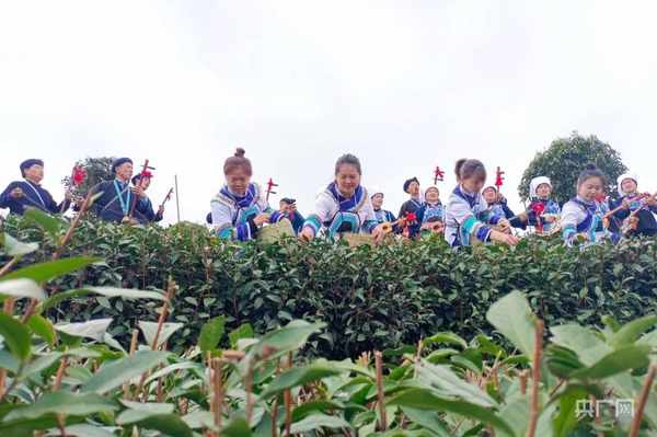 活动当天,茶山上的茶树绵延伸展,每一株茶叶的嫩芽鳞次栉比般排列在茶树中,伴随着布依八音队伍弹唱着《采茶曲》,村民们按照都匀毛尖独芽的标准,采摘着今年的首批春茶。茶树上的嫩芽,外形披好,条索卷曲,芽叶匀嫩饱满,色泽翠绿明亮。