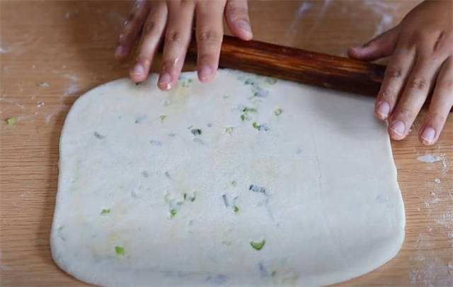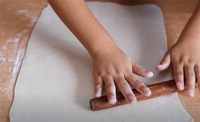 3.处理面剂的时候不用揉,直接用擀面杖擀成长方形的饼皮。