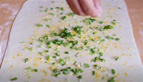 4.擀好之后表面先刷一层葱油,然后再撒一层比较细腻的玉米面,再放一层葱花,最后的时候再放盐来调味。