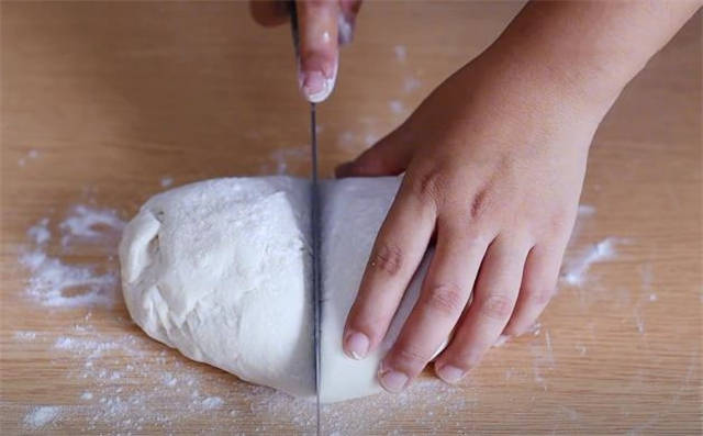 2.时间差不多到了,我们的面团也饧好了,案板上撒些干面粉,面团饧好之后,我们直接分成两个面剂来操作。