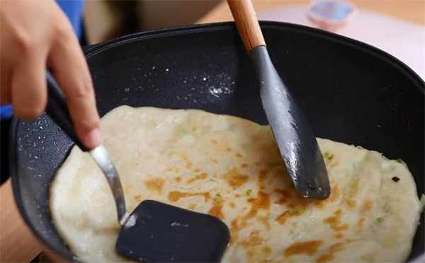 9.烙了不到2分钟,饼的底面已经变色了,这时候我们翻个面继续烙,烙熟即可出锅。