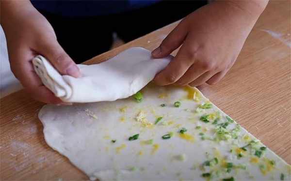 6.叠饼皮的时候直接顺着一端叠起来,最后把这个封口处给收紧。