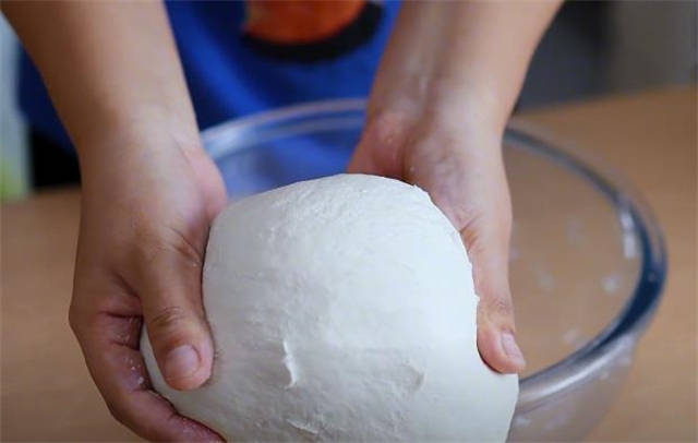 1.我们先准备上500g的普通家用面粉,和面的时候,我们一半用150g的开水烫一下,另外一半的话,就用同等重量的凉水来和面,搅拌成大块的面絮状之后,咱们加上一些食用油,烙出的饼表皮会更酥,最后的时候,我们一直把面团揉到这种光滑匀称的状态就可以了,封上保鲜膜,饧面40分钟,让面筋自己形成。