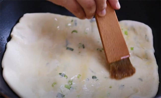8.烙饼之前一定要先把锅预热好,然后刷层油,饼皮表面再刷一层油,可以锁住饼的水分,这样咱们烙出的饼也会更加松软。
