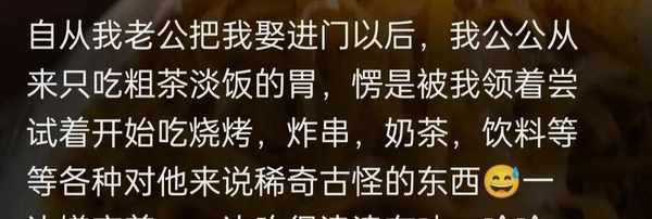 这是发生在陕西的一幕,一名女子称,自从结婚后,公公原本粗茶淡饭的胃硬是在她的带动下尝试了不少“稀奇古怪”的东西,公公一边嫌弃着,一边吃得津津有味让女子忍不住拍下了视频。