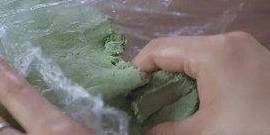 趁艾草糊非常热的时候倒入糯米粉和粘米粉中,我倒了大约480ml艾草糊