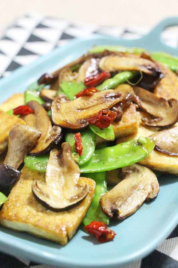 3.热锅放少许植物油,切好的姬松茸下锅煎至稍干,再放姜片和干辣椒,接着放荷兰豆稍煸炒,最后放入煎好的老豆腐,放少许盐调味,起锅前放有机酱油。